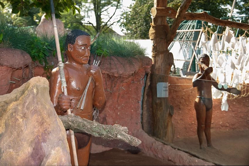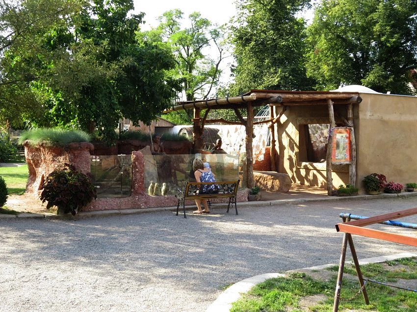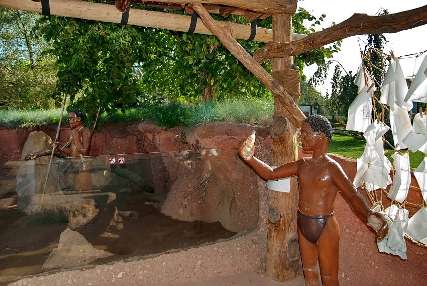 Neposedné šelmičky mají uprostřed výběhu vysoký kámen, který často využívají ke hlídkování a také sochu Křováka v životní velikosti. Druhá socha muže nejstaršího etnika světa je v "kině" mezi výběhem a ubikací. Ten slouží hlavně pro fotografování a má představovat známého XiXaa z filmu "Bohové musejí být šílení", kterého ztvárnil neherec - originální Křovák N!xau. Bohužel mu návštěvníci často zcizují lahev od Coca-Coly.