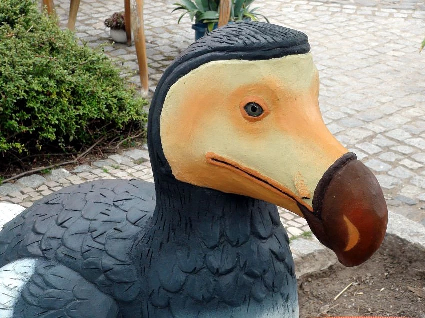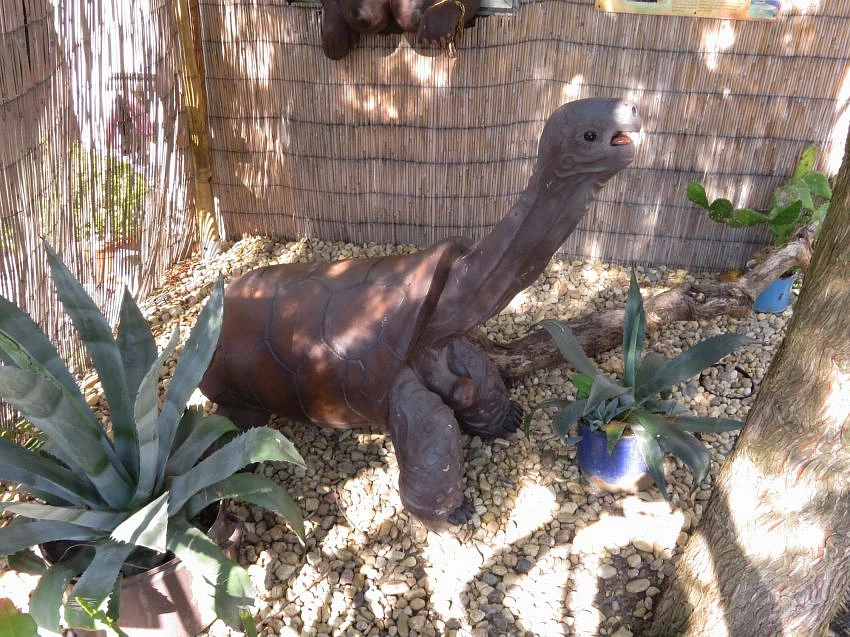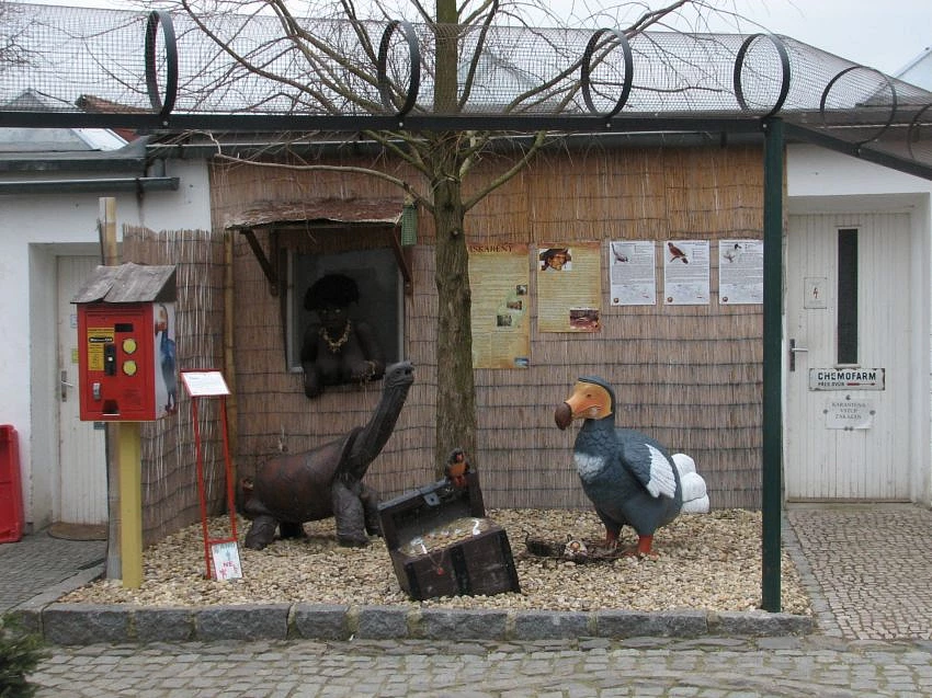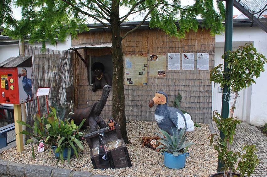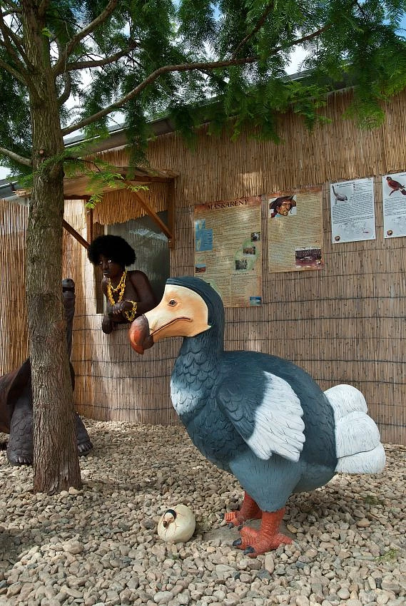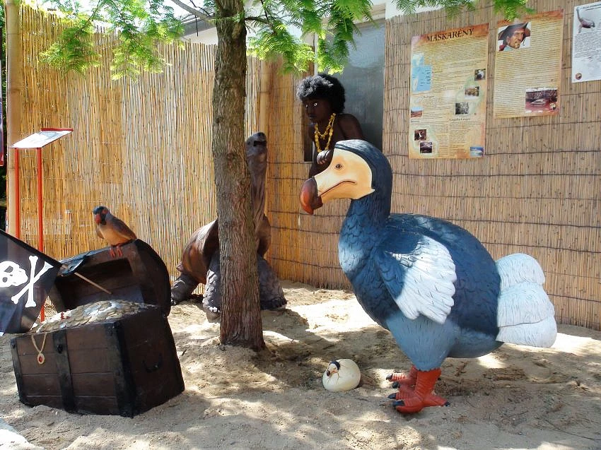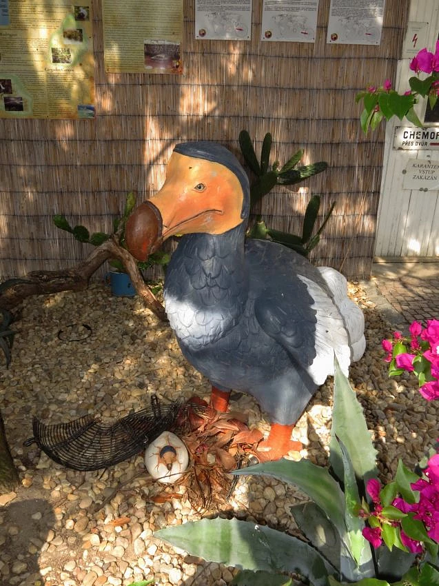 Zcela první se ve fotokoutku objevila železobetonová socha (v životní velikosti) právě notoricky známého maurijského nelétavého ptáka doda, a to dospělého jedince a právě se klubajícího mláděte. Ten byl však příliš osamocený, tak jsme k němu přidali unikátní velkou želvu Vosmaerovu, která obývala Rodriguez  v takovém množství, že se prý po jejích krunýřích dalo chodit aniž by člověk musel šlápnout na zem. Tato želva, příbuzná známým želvám obrovským ze Seychel, je výrazná svým tzv. sedlovým krunýřem (ve tvaru koňského sedla) - v přední horní části je vyklenut nahoru. Druhým nápadným a ještě výraznějším znakem této želvy je až metr dlouhý krk. Díky vyklenutému krunýři jej želva dokázala vytáhnout velmi vysoko a mohla tak spásat vyšší rostliny (keře). V angličtině kvůli tomu bývá označována také jako žirafí želva.
