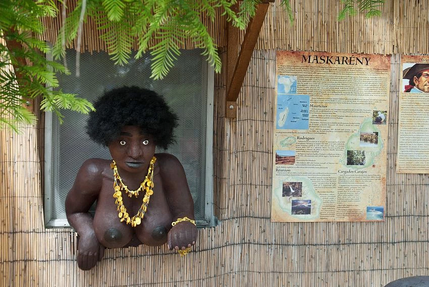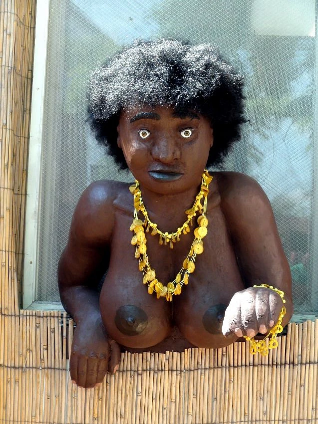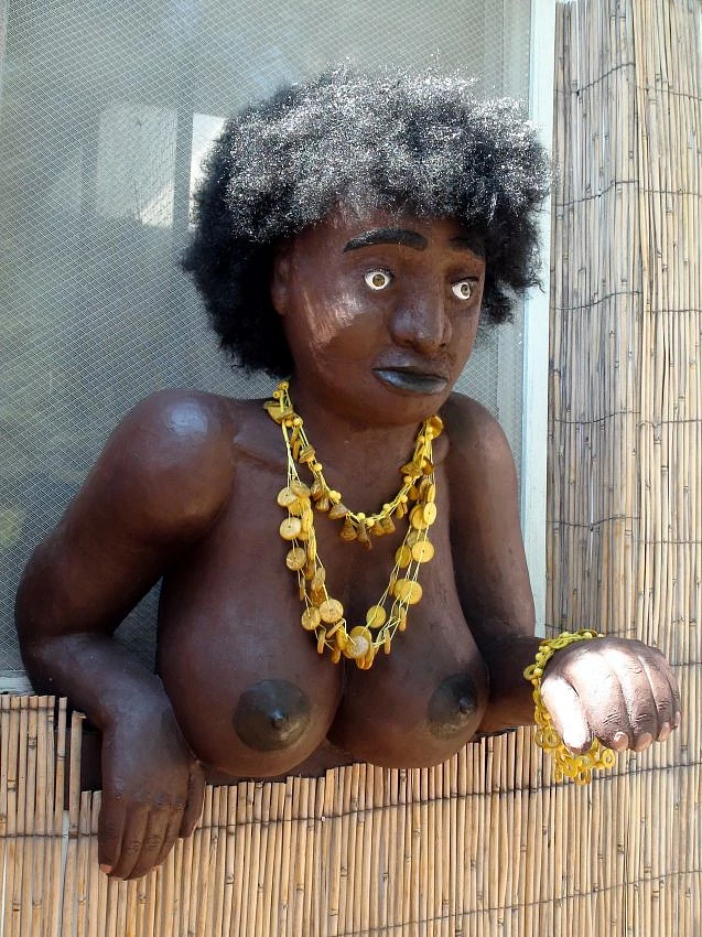 Okolo fotokoutku jsou bambusové nebo rákosové rohože, aby na fotografiích nebylo rušivé pozadí. Přesto se jeden rušivý detail objevil, a sice okno budovy, před níž se fotokoutek nachází. Nebylo možné jej zazdít, proto jsme volili jinou, poněkud vtipnou, variantu. Do okna jsme umístili sochu černošky, přesněji řečeno míšenky z etnika Kafrů (potomků původních černých Afričanů a bělochů), která kouká z okna ven. Ta se stala záhy jedním z nejfrekventovanějších fotoobjektů, ačkoli je to způsobeno velmi pravděpodobně jejím oblečením typickým pro africké domorodce (není oblečená) a zároveň tím, že je v horních partiích těla velmi obdařena.