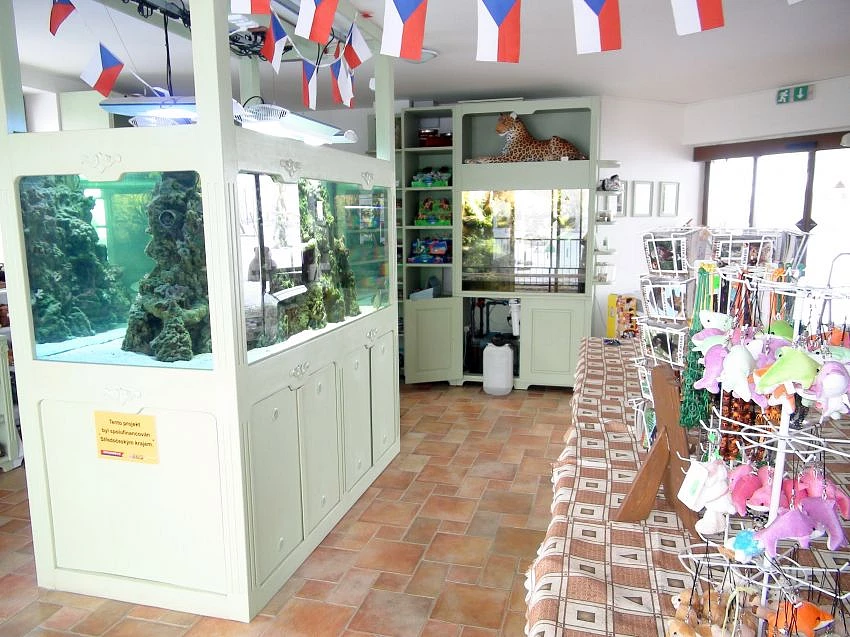 Kromě jmenovaného je budova ekocentra vybavena i sociálním zařízením (též pro vozíčkáře), občerstvením s venkovním posezením pod slunečníky u dětského hřiště a v neposlední řadě i obchodem se suvenýry. Ten, kromě prodeje propagačních materiálů a suvenýrů slouží i jako východ ze zoo a zároveň jsou zde expoziční akvária - velké centrální mořské akvárium s korálovými rybkami, korály a sasankami, dlouhé jihoamerické sladkovodní akvárium jehož vodu brázdí hejno skalár a dvě arowany, unikátní akvárium sladkovodních rejnoků - trnuch, které je zabudované do prodejního pultu a také malé paludárium s tzv. šípovými žábami pralesničkami.