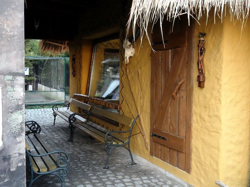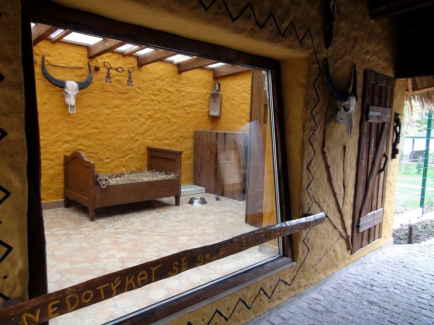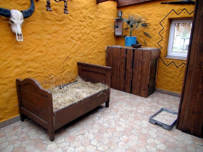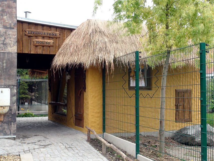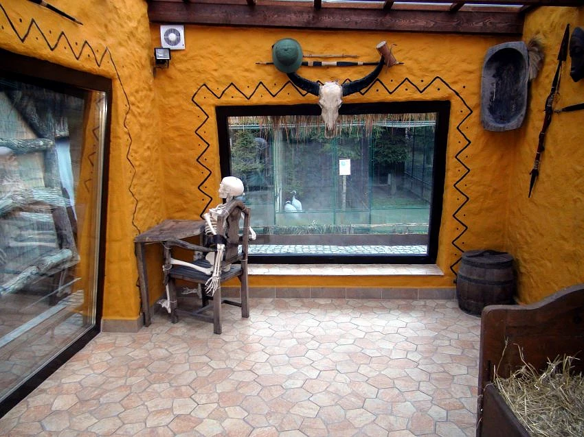 Prosklená vnitřní ubikace je pojata jako Livingstonovo africké obydlí. Na stěnách visí různé domorodé artefakty, jako luky, šípy, buvolí lebka, rukodělné dřevěné sošky a jiné výrobky. Interiér je vybaven skromným dřevěným nábytkem - malou postelí, v které spávala gepardice a rohovým stolečkem u kterého na židli sedí lidská kostra v tropické přilbě a nábojnicovém pásu. S trochou nadsázky tedy dům, v němž Livingstone zemřel a který poté obydlel gepard, přesněji řečeno gepardice Mzuri.