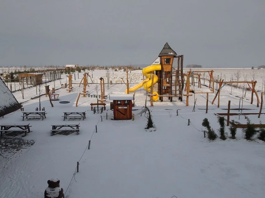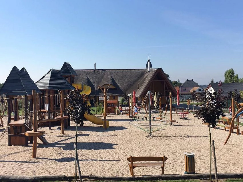 Celé ploše dominují 3 dřevěné domečky, či věže, z nichž dvě jsou opatřeny tobogány, všechny jsou vzájemně spojené několika úseky lanových a jiných prolézaček, či spíše přelézaček nebo "opičích drah". V přední části jsou jednodušší prvky pro nejmenší děti, v zadní složitější pro starší děti. Vedle zmíněných 3 domečků, 2 tobogánů, více než 100 m lanových opičích drah je zde několik houpaček, 2 houpací koše, skupinová houpačka pro houpání ve stoje, 2 různé kolotoče, nebo 18 m dlouhá lanovka, ale třeba i tabule na kreslení. K tomu je třeba ještě přidat velké pískoviště kryté plachtou (kvůli zastínění), kde je malý mechanický bagr.