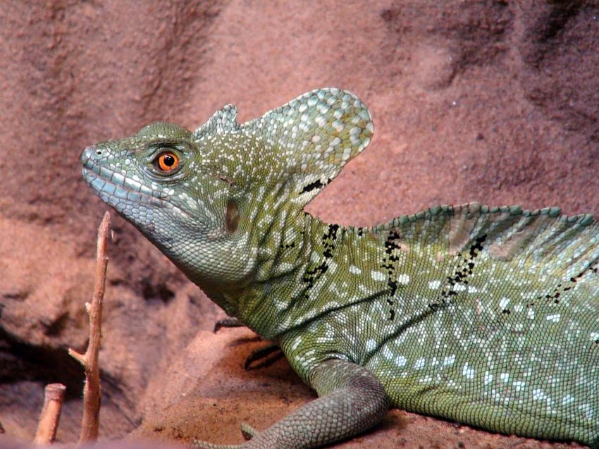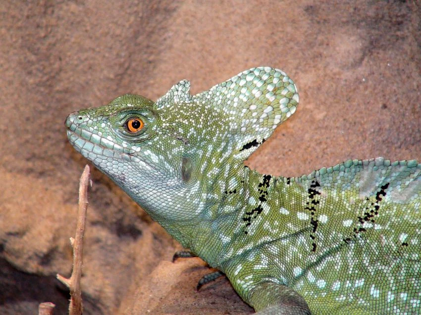 zelená ještěrka se světlými bílými nebo namodralými skvrnami, tenkým dlouhým ocasem, dlouhýma zadníma nohama a hřebenem na hlavě, hřbetě a ocasu.
