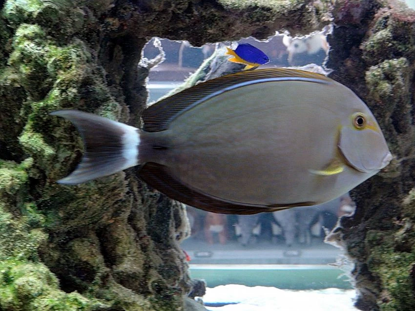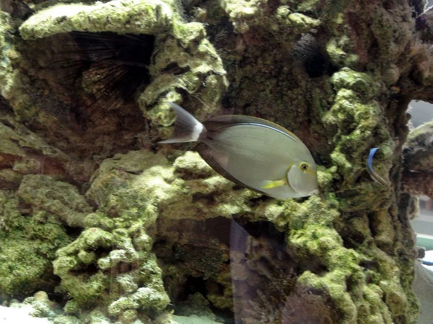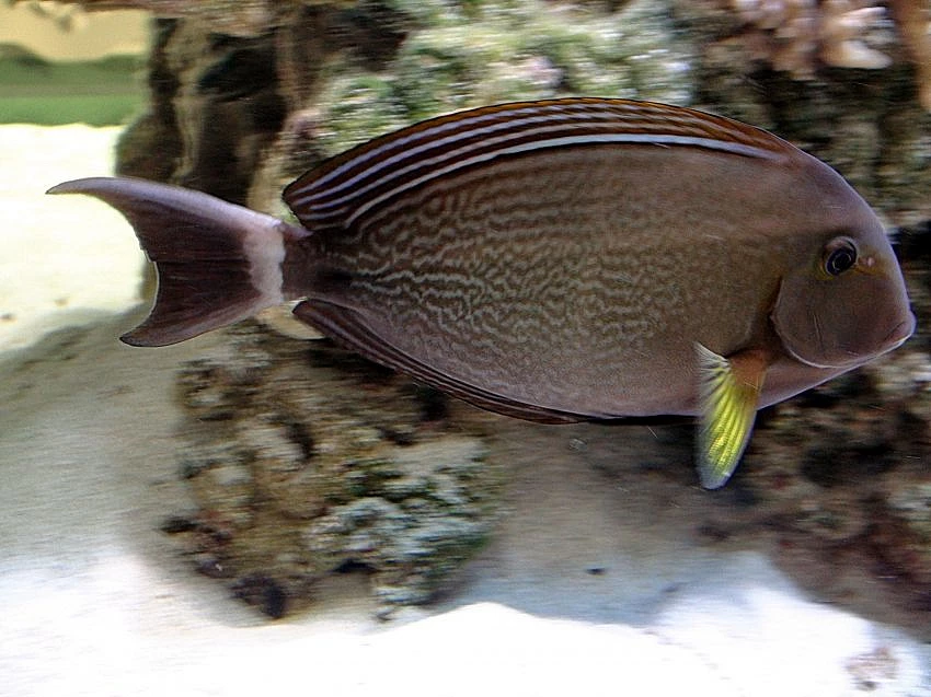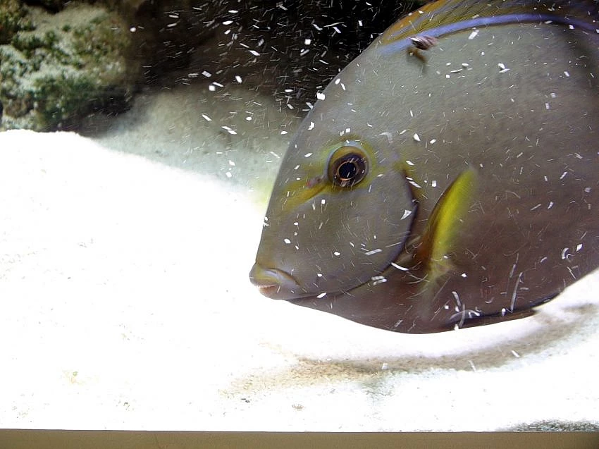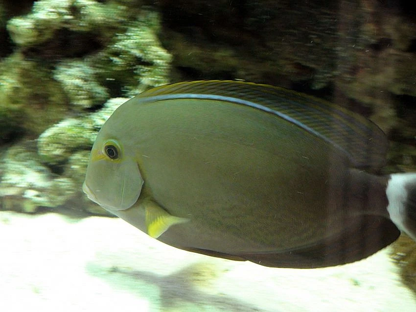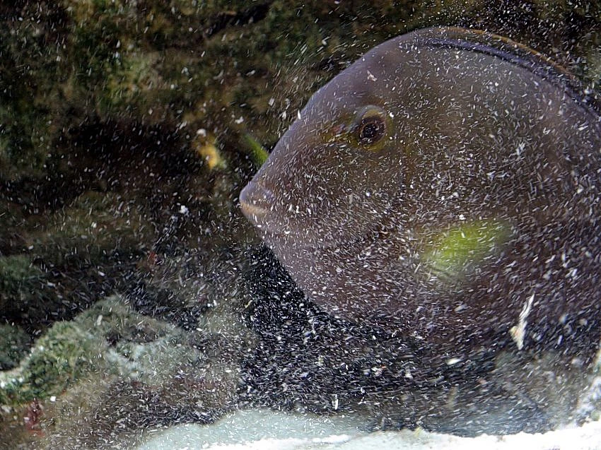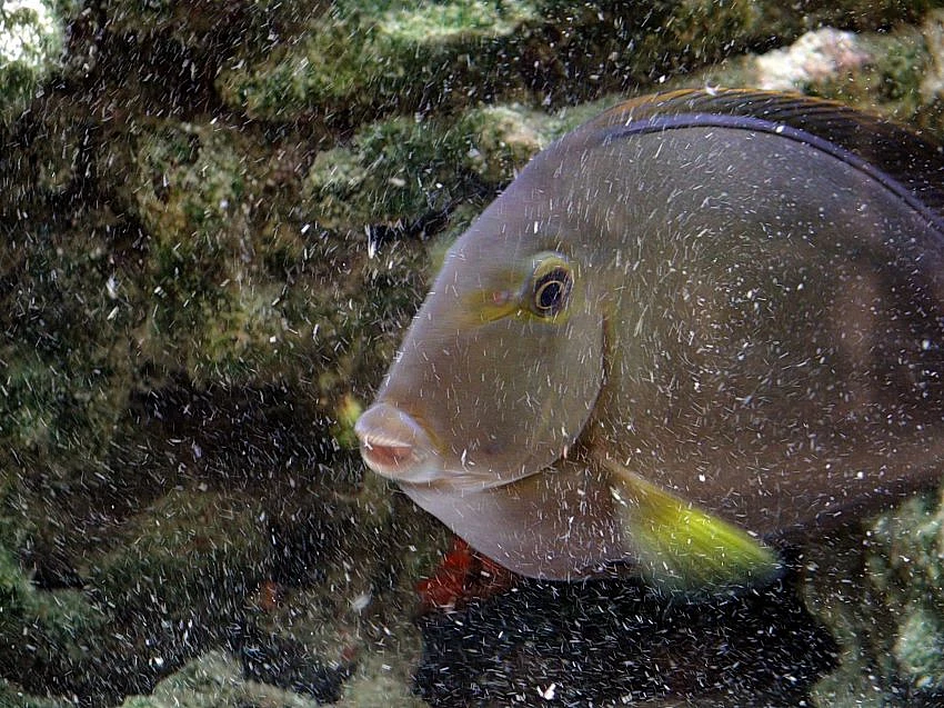 v akváriích poměrně vzácná oválná modro šedá ozubená ryba s četnými drobnými žlutohnědými až tmavo hnědými skvrnkami a podélnými modrými proužky na ploutvích