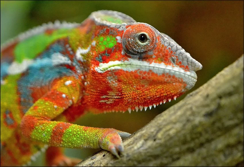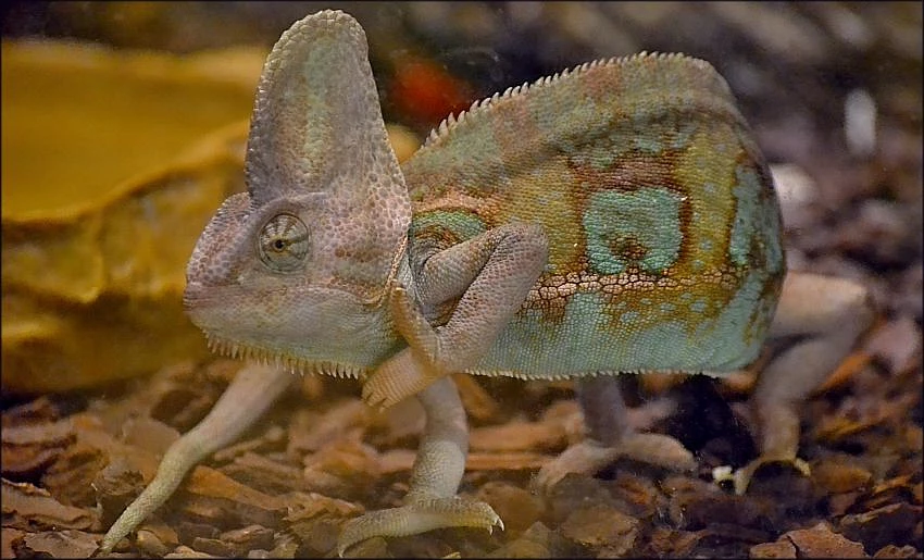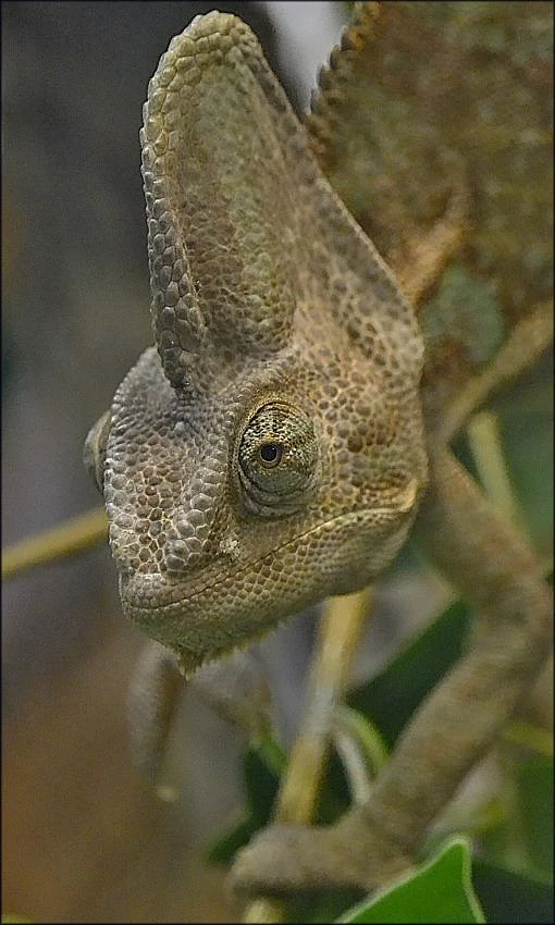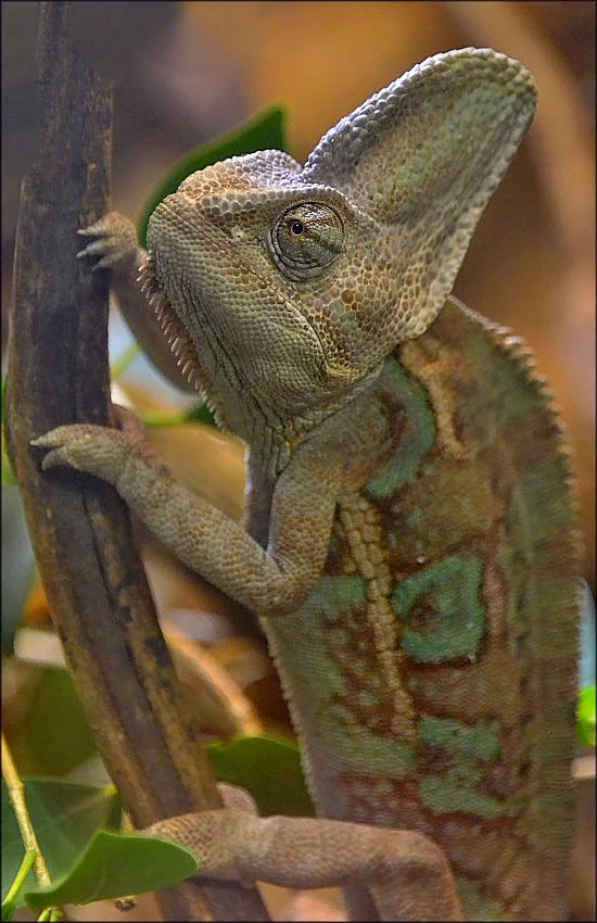 velký druh chameleona, typický výraznou přilbou a hrdelním hřebenem. Jeho základní zbarvení je zelené s pruhy a skvrnami ve žluté hnědé a modré barvy. Podle nálady a světla chameleon mění základní zelenou barvu od světle žlutavě zelené až po tmavou olivově zelenou. Samice bývají méně barevné a nápadné.