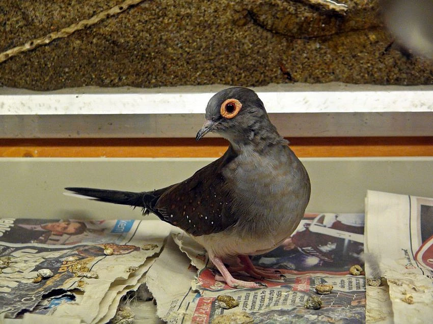 malý holub se skvrnitými křídly, s šedomodrou hlavou, krkem a hrudí, šedohnědými zády a ocasem, krémovým břichem, červeným okolím oka a růžovýma nohama. Mezi chovateli okrasných ptáků již však existují i různé barevné mutace (stříbrné, izabelové, skořicové, mramorované, žluté, červené...).