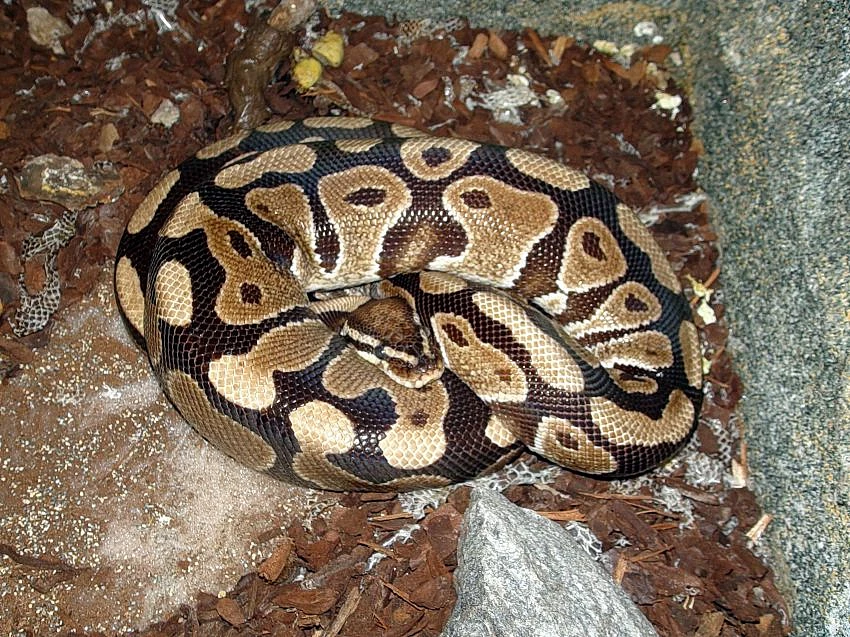 menší hroznýšovitý had (tedy nejedovatý šktič), který má viditelně oddělenou hlavu a ocas od těla. Je hnědá s velkými světlejšími (žlutými, bělavými nebo až hnědými) skvrnami, ale existuje řada odchylek s jinou barvou nebo zcela jinou kresbou (běžní jsou např. i albíni), celkem je prý mezi chovateli na 4000 různých vzhledů.
