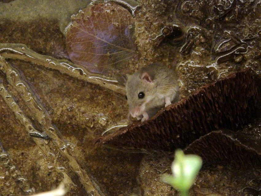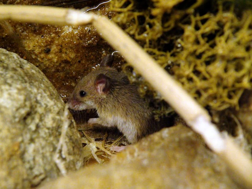 maličká, dokonce nejmenší myška s šedým až cihlově červeným tělem a bílým břichem