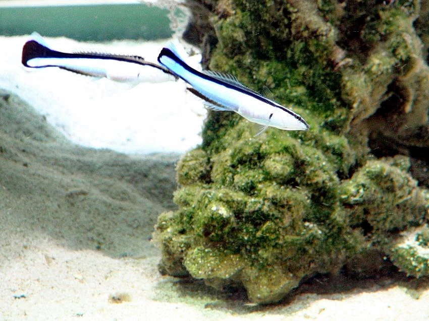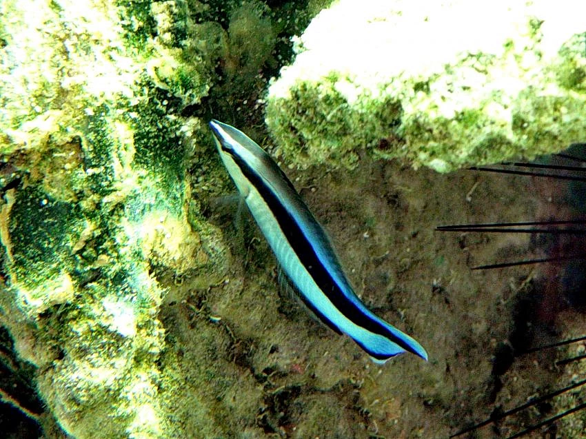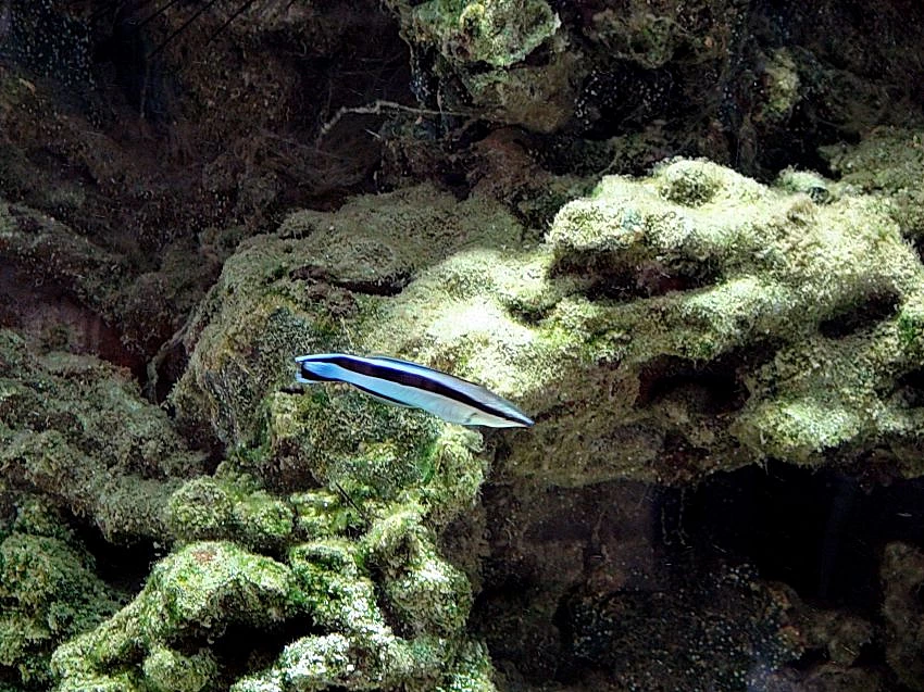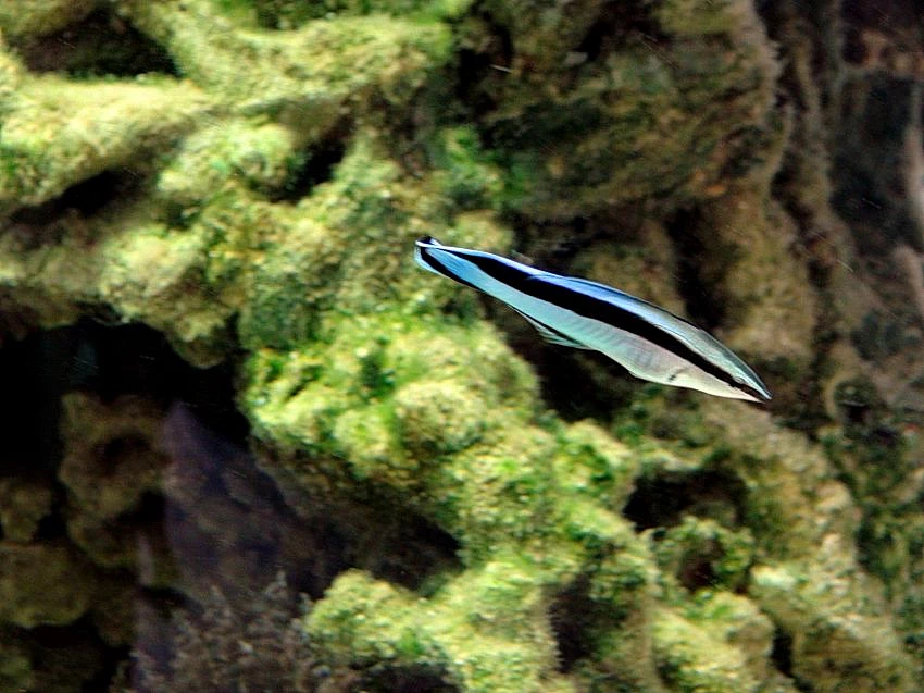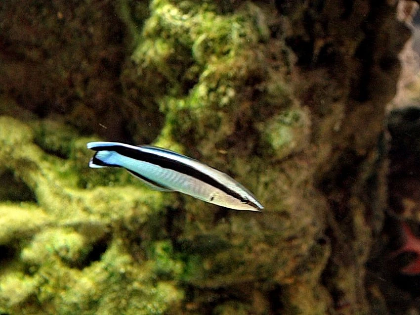 malá podlouhlá tzv. čistící rybka (požírá parazity a mrtvou tkáň z kůže jiných ryb). Je světle modrá (spodní polovina těla je světlejší, někdy až do bíla) s výrazným širokým černým podélným pruhem a žlutou nebo oranžovou horní částí hlavy.