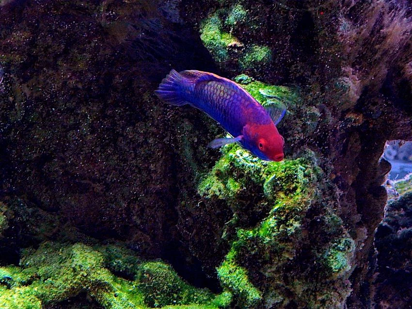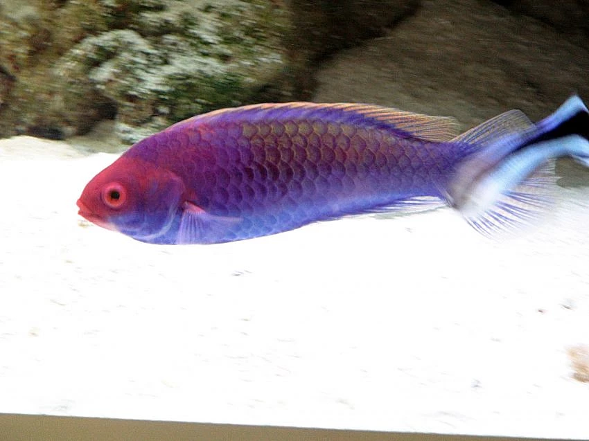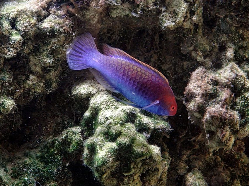 podlouhlá korálová rybka s oranžovou, oranžovozelenou, nahnědlou nebo červenou barvou na hlavě, která plynule přechází do modré na zbytku těla