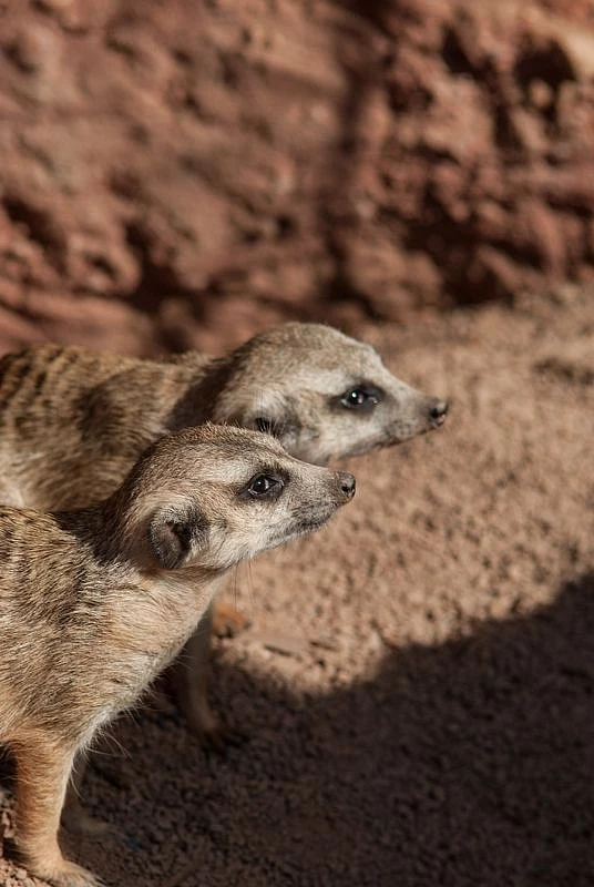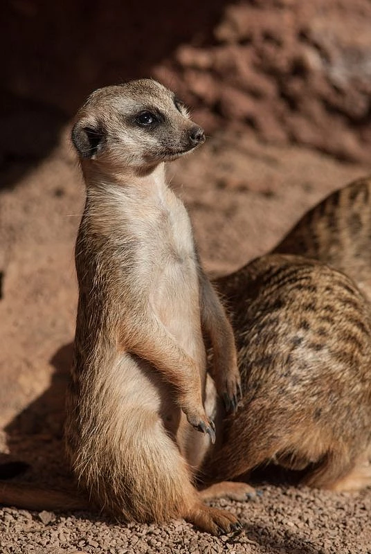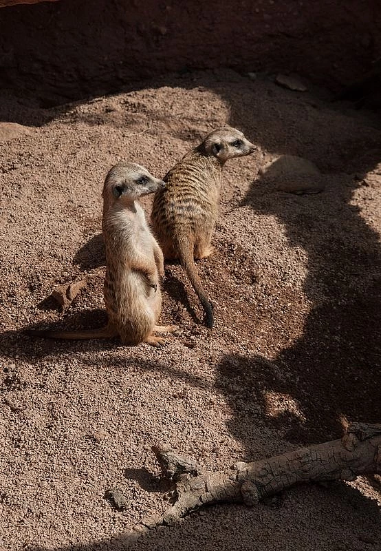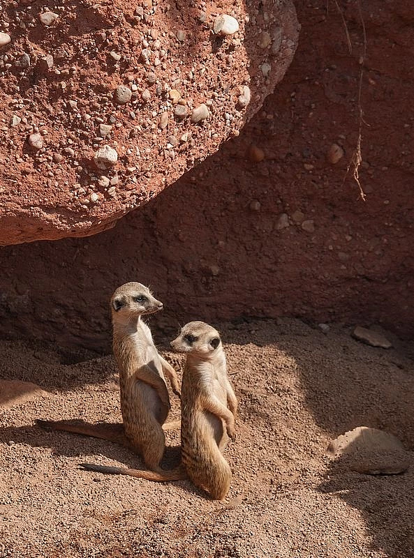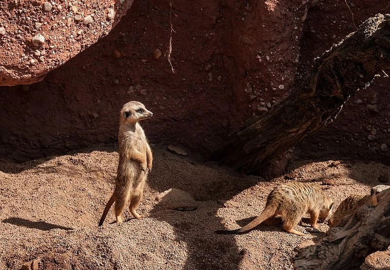 V poušti klesá teplota v noci k nule, proto surikaty každé ráno vylézají z nor a nejdříve chytají sluníčko, aby se zahřály, teprve pak vyráží na lov. Zatímco celá kolonie hledá něco k snědku, několik jedinců zůstává na hlídce - na vyvýšeném místě (kámen, keř atd.) sedí na zadních nebo stojí a pozorují, co se děje v dáli okolo kolonie (surikaty výborně vidí na dálku, mnohem hůře na blízko). Pokud se blíží nebezpečí hlídka upozorní zbytek skupiny pištěním nebo kvokáním, při velkém nebezpečí vydávají štěkavé nebo vrčivé zvuky, které jsou signálem k okamžitému zalezení do nor. Někdy surikaty sdílí nory s mangustami liščími a sysly.
