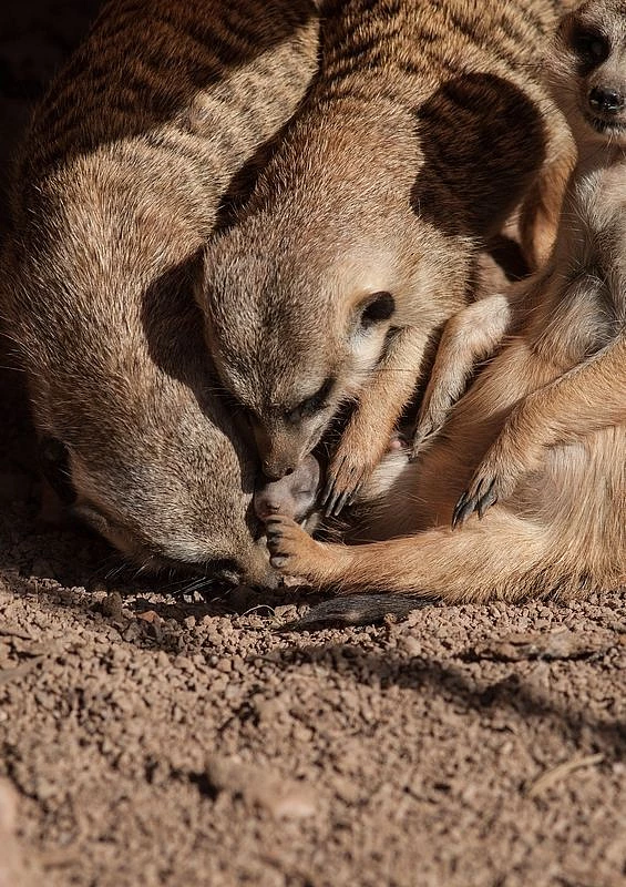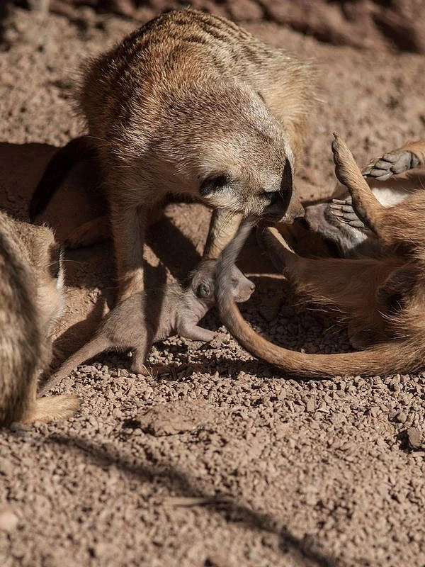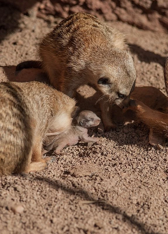 2 - 5 mláďat se rodí slepých, vidět začínají až zhruba po 2 týdnech. Dominantní samice obvykle zabřezne ihned po porodu, proto se o její mláďata stará zbytek smečky. Mláďata tráví první měsíc života v noře, kde sají mléko nejen od vlastní matky, ale i od kterékoli jiné samice, která má také mláďata nebo o ně přišla. Pokud zůstanou mláďata v noře sama a objeví je surikaty z jiné skupiny, zabijí je.